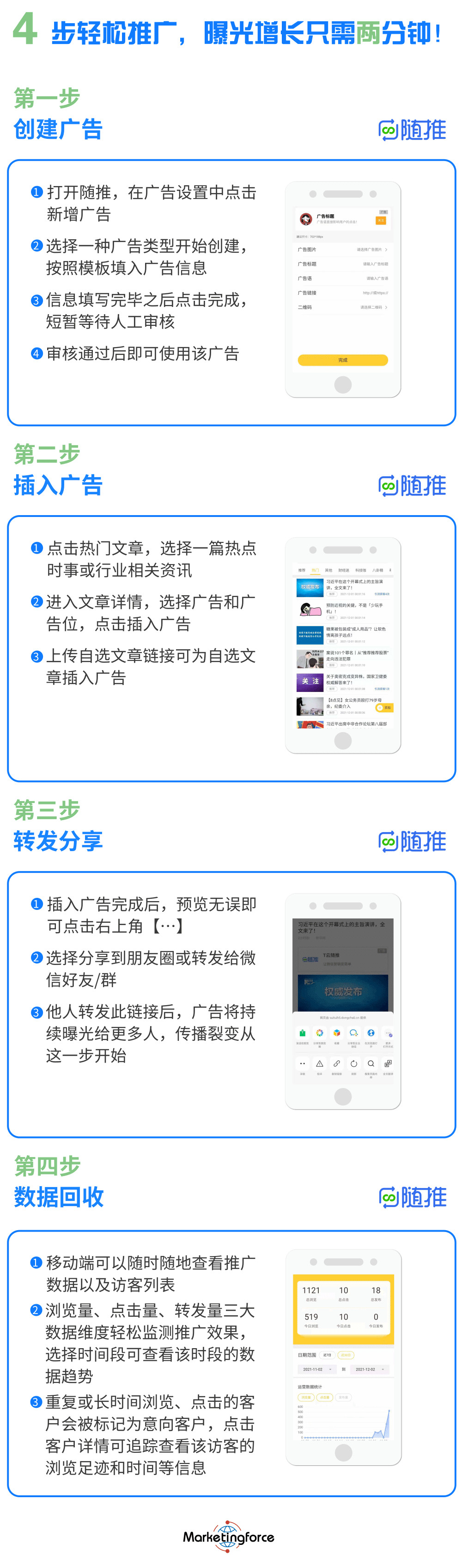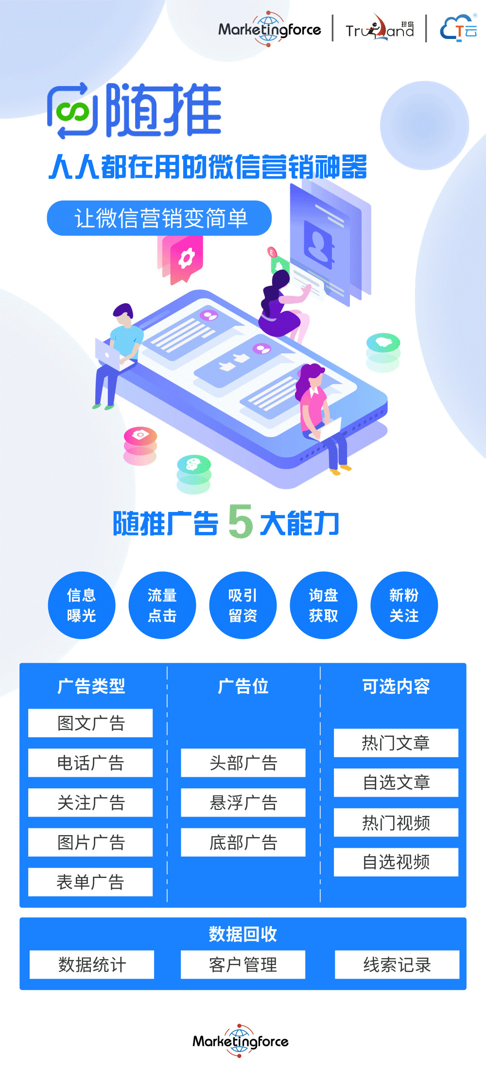 名片、廣告一次創建,后期無限使用,基于熱門文章、短視頻分享可以借助內容得到曝光,轉發分享也能保留廣告,快速傳播裂變,實現穩定流量曝光。