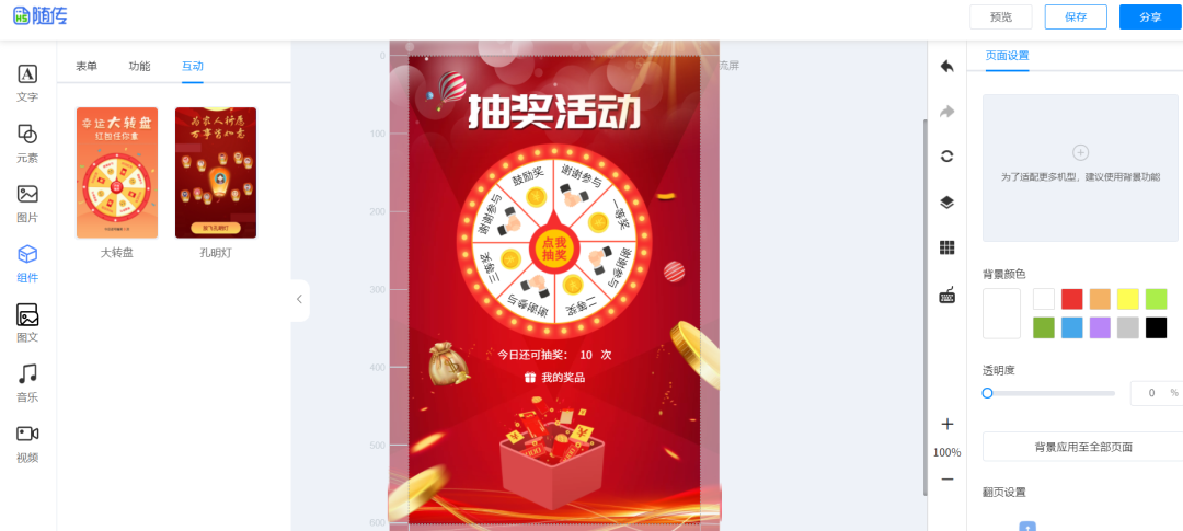 隨傳是一種可快速上手,制作H5的工具。內置多種營銷組件,通過一些小型的營銷活動來增加用戶的粘性,分析用戶對產品需要的緊急程度。比如:大轉盤、孔明燈等市場火熱的營銷互動組件,可以吸引用戶,實現移動端用戶不斷增長和活躍。