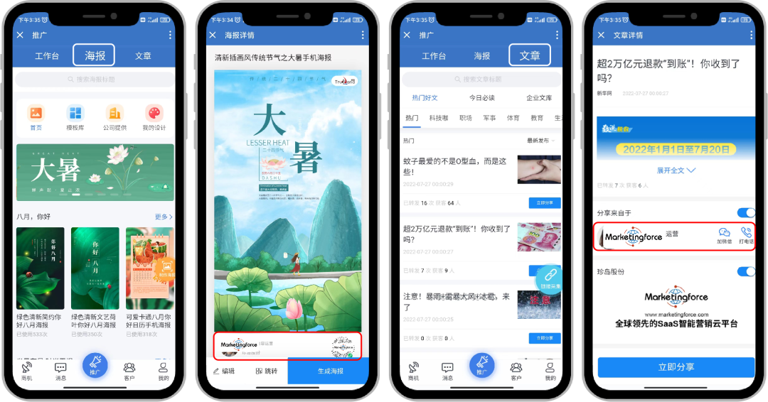 臻推寶可將個人名片鏈接到宣傳物料上面,高效產出創意內容后,通過分享達到裂變獲客的目的,讓每一份物料都成為拓展客戶的渠道。再把客戶沉淀成數字資產,達成長久穩定的溝通關系。
