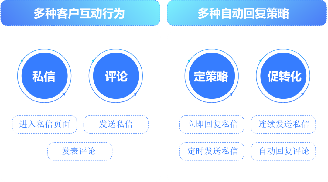系統無需有人值守,全年無休,根據客戶互動行為,準確及時推送預設好的卡片消息、文字消息及評論回復內容。通過多維度策略與多種執行動作的組合,滿足海量營銷場景。