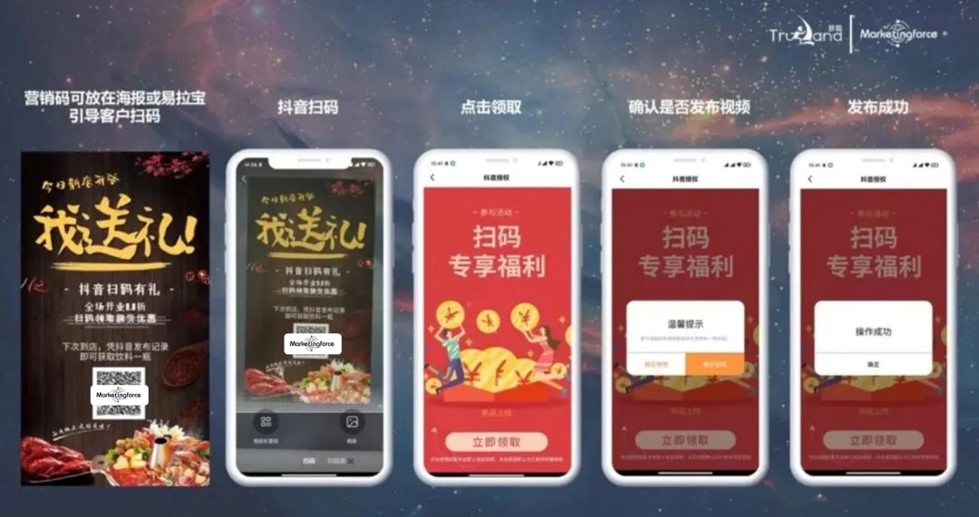 借助T云視頻魔方的同城拓客,商家就可以在抖音上玩轉POI營銷。在門店易拉寶或海報上印刷營銷碼,設置優惠活動吸引到店客戶掃碼,在發布帶有POI的門店視頻后自動領取優惠,這樣客戶的好友,及門店周邊的人員也能刷到門店視頻,幫助門店迅速擴大宣傳,帶來更多準確客戶。