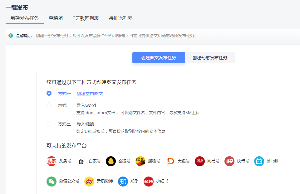 一鍵發布圖文,可以通過三種方式創建圖文發布任務,可以在軟件上編輯發布,也可以在電腦word上編輯完成導入軟件,也可以導入已有鏈接,在已有文上進行更改發布,非常方便,只要是可支持的平臺都能一鍵發布。