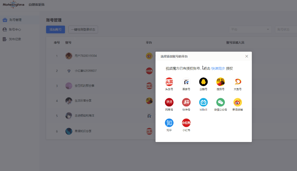 在自媒體矩陣軟件找到添加賬號按鈕,找到軟件中間的彈窗對應的新媒體平臺