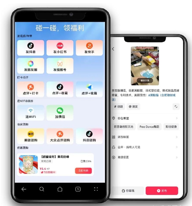趣碰趣碰NFC推廣基于手機的NFC功能和先進的,用戶只需輕輕一碰,即可自動生成高質量的視頻與文案。系統支持一鍵分享至抖音、、等主流社交平臺,為商家提供精準的市場營銷解決方案。它有效促進流量的裂變增長,幫助商家實現持續的客戶引流和拓展。